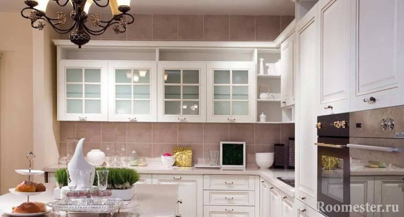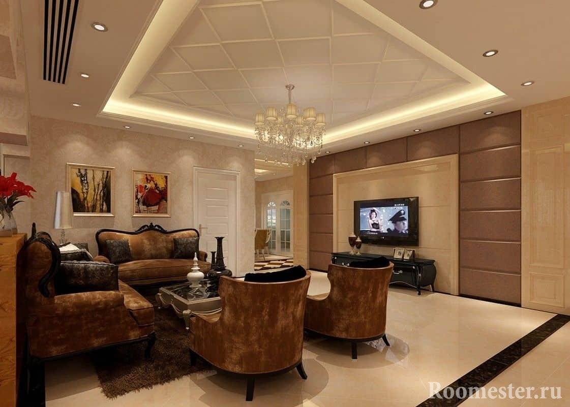 Потолок. Предпочтительны классические варианты отделки, побелка и покраска; часто присутствует лепнина в тон потолку. Люстра, как правило, выбирается классическая: большая, с хрустальными подвесками. От натяжных и подвесных потолков лучше отказаться. Если без них никак не обойтись, выбирают однотонный матовый вариант.