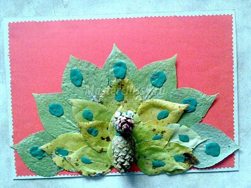 - павлина. К туловищу-шишке приклейте на пластилин несколько разноцветных осенних листьев. Это будет хвост. Голову-желудь прикрепите также с помощью эластичного пластилинового материала.