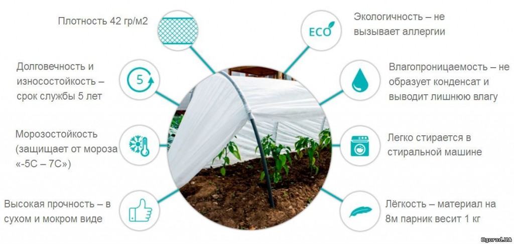 прочный и долговечный, может быть многократно использован в течение нескольких сезонов; благодаря пористой структуре пропускает воду и воздух, способствует созданию благоприятного микроклимата в парнике; пропускает солнечный свет, но при этом защищает растения от обжигающих лучей; предохраняет почву как от пересыхания, так и от обильных осадков, создавая идеальную влажность воздуха;