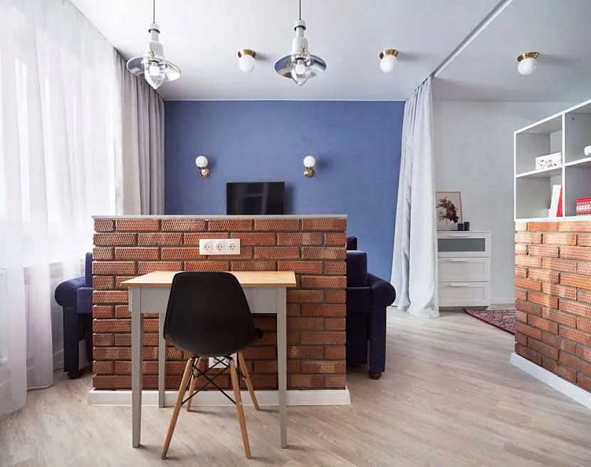 - Планировка: перегородка заменяет стены, с помощью которых в общем пространстве формируются отдельные зоны: место для приготовления пищи, комната отдыха, обеденная группа.