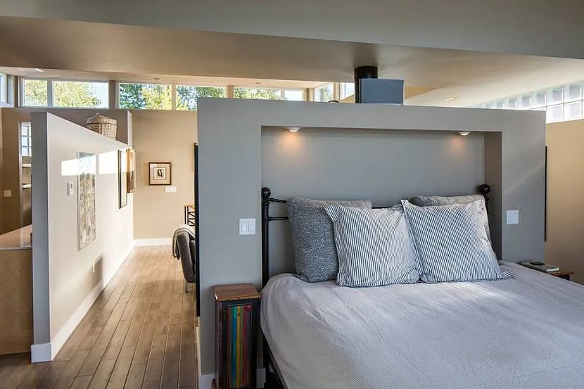 На фото интерьер спальни с низкой перегородкой из гипсокартона серого цвета.