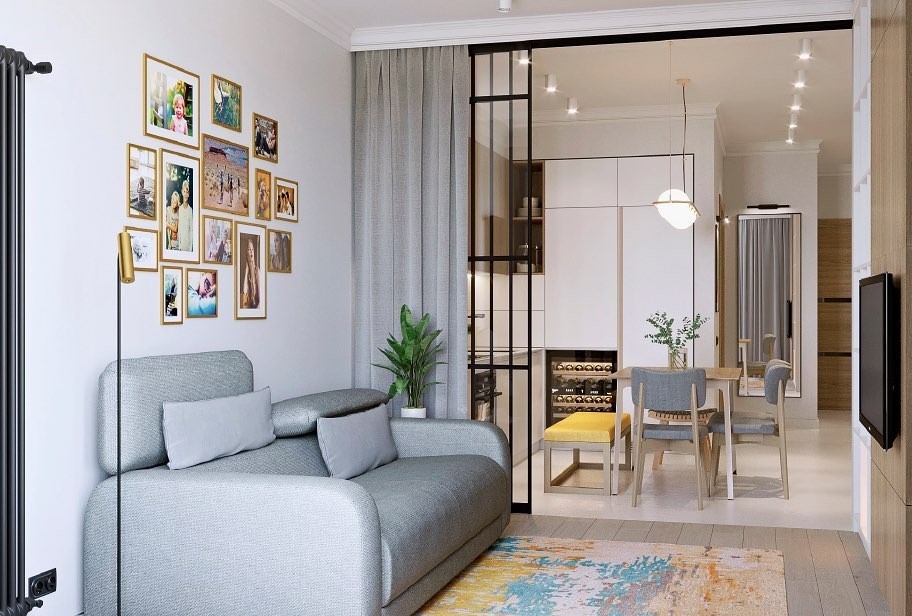 Если кухня-гостиная очень маленькая, дизайнеры советуют использовать раздвижную перегородку с прозрачными панелями, которая не будет ограничивать доступ света в разные зоны кухни-гостиной. Такая конструкция отлично справляется с зонированием пространства.
