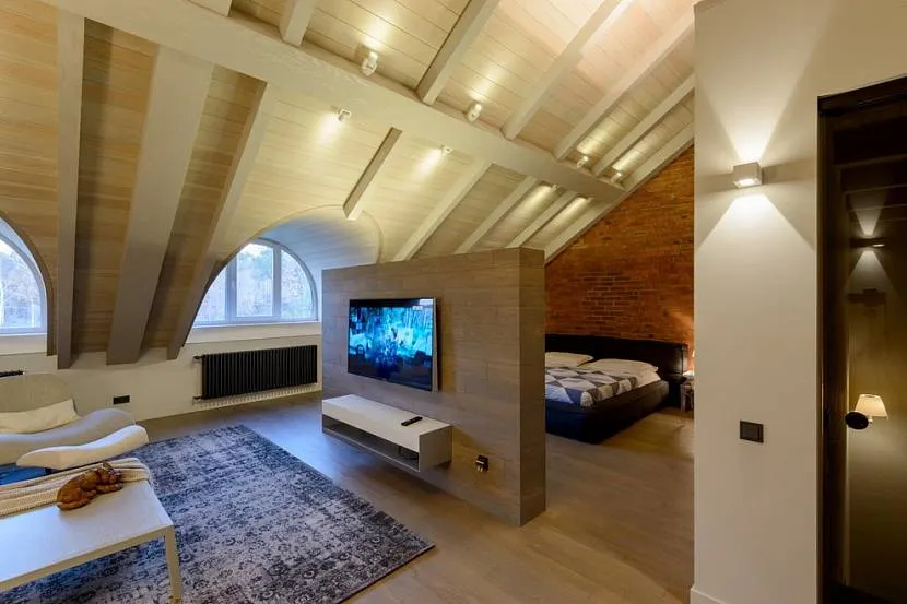 Телевизор может быть установлен вместе с кроватью, а может совершенно отдельно, например, с диваном. И тот и другой вариант довольно прост и удобен в исполнении. Конечно, для такой перегородки, если приоритетным фактором является звукоизоляция, лучше устанавливать из кирпича.