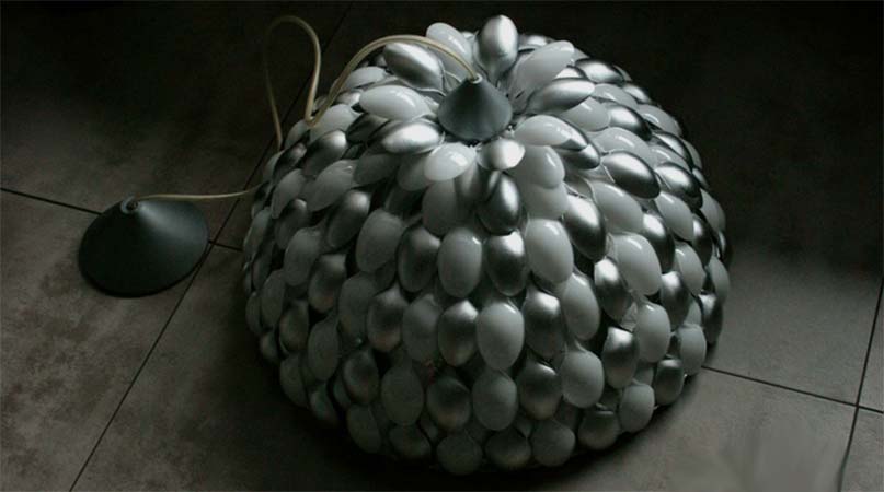 - Одноразовые пластиковые ложки. У этого материала несколько преимуществ: низкая цена, безопасность, устойчивость к нагреванию. В роли основы абажура выступает пластиковая бутыль из-под воды, у которой срезано донышко. Начиная с нижнего края на бутыль рядами наклеивают ложки выпуклой стороной наружу. У ложек предварительно отрезают ручки. Через отверстие в горлышке продевают шнур и прикрепляют к нему патрон с лампой. Верхнюю часть светильника можно замаскировать непрозрачным стаканом из пластика.