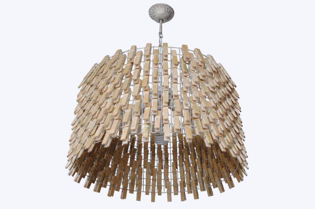 - Деревянные прищепки. Склеив их боковыми частями с помощью суперклея и прикрепив их в несколько рядов к деревянной основе, можно получить ажурный плафон.