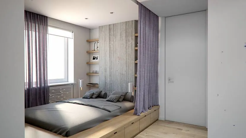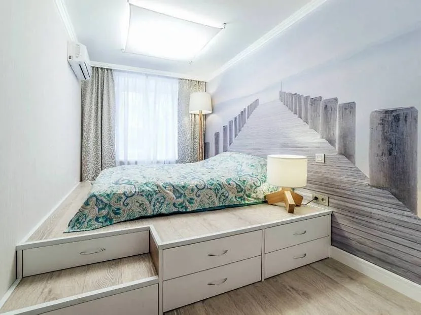 Толстый матрас в натяжной простыне будет выглядеть, как полноценная кровать, но при этом вы сэкономите не меньше 15 сантиметров на корпусе самой кровати. На проход между стеной и предметами должно оставаться не меньше 40 см, лучше — 50 – 55 см.