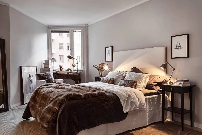 Несмотря на маленькую площадь, дизайнеры не советуют ставить кровать длинной стороной вплотную к стене. Гораздо элегантнее выглядит кровать с изголовьем у стены, по бокам которой стоят прикроватные тумбочки (или столики) с индивидуальным освещением. При таком расположении логичным, экономящим место, шагом будет размещение телевизора на противоположной от изголовья стене.