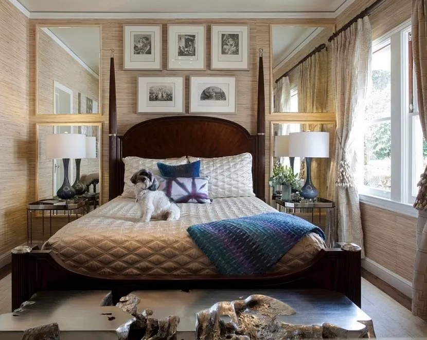 В случае, когда спальня получается совсем маленькой, попытайтесь расширить торцевую стену с изголовьем декораторскими приемами: например, оформить ее зеркалами или обоями с оптическим эффектом.