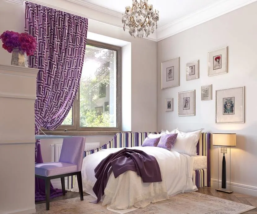 При планировке необходимо учесть, что в такую комнату проникает больше света. Поэтому кровать лучше установить в том месте, куда утром не попадают солнечные лучи.