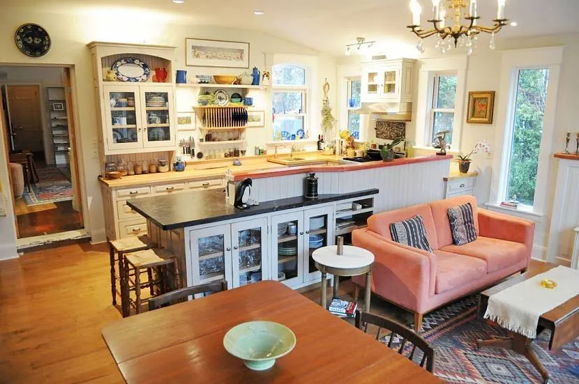 В интерьере дома кухня, совмещенная с гостиной, может представлять собой островной гарнитур. Здесь могут находиться плита и мойка или длинная барная стойка. Зону гостиной можно выделить, исходя из материала, из которого сделан коттедж. Например, в деревянном доме на стенах рекомендуется использовать дышащие поверхности. В кирпичных домиках чаще всего выбирают другие покрытия, дополняющие стиль всего помещения.
