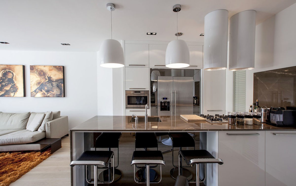 Правильное расположение световых точек поможет подчеркнуть значимые зоны и углубить места для отдыха. Например, ланч-территорию в современном дизайне кухни-гостиной обозначит «местное» освещение – светильники располагают по периметру стола.