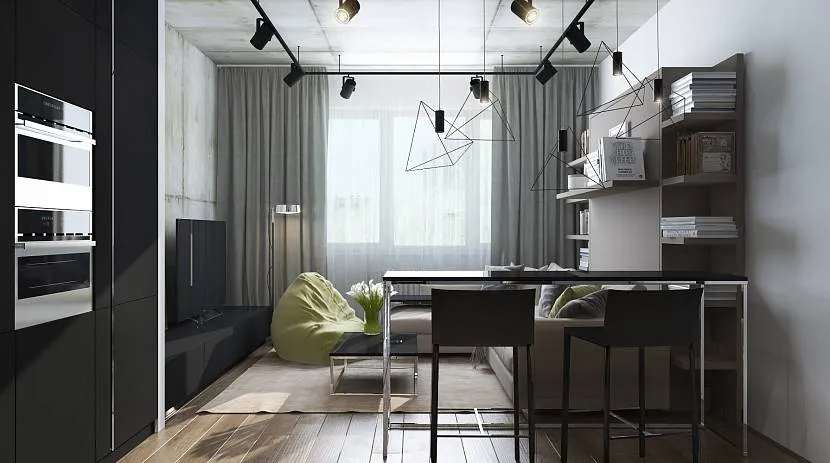 Планирование пространства на столь ограниченной площади подчиняется простым законам лаконичности, функциональности, эргономичности. В такой комнате присутствует как минимум две зоны — кухня и непосредственно гостиная, но может быть включена столовая. Хотя для нее остается совсем мало места, поэтому вместо обеденной группы часто используют барную стойку, полуостров — это лаконичная альтернатива столовой, которая одновременно служит инструментом зонирования.