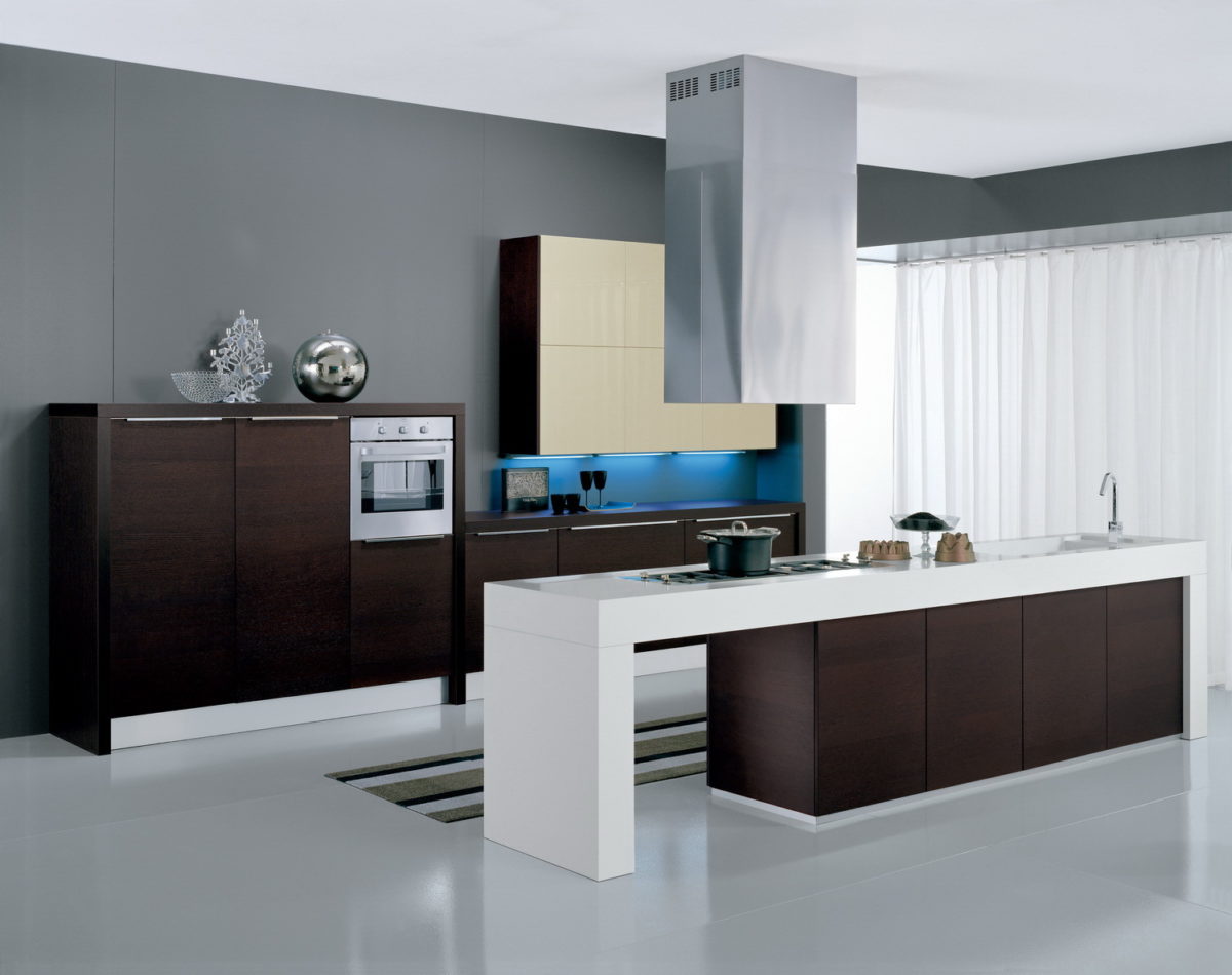 - Хай-тек – чаще всего эксклюзивный дизайн с технологичными новинками, футуристичными чертами или же простыми поверхностями с «космической» отделкой – глянцем, металлическим блеском, зеркальным перламутровым покрытием. Здесь как обеденная группа, так и сама рабочая зона может быть выполнена нестандартным образом, что само по себе формирует композицию и является средством зонирования, выделяя основные зоны в интерьере.