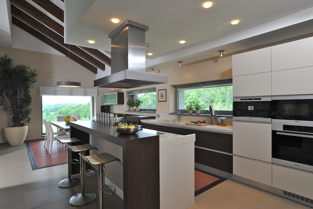 Огромный плюс частного дома заключается в том, что разместить плиту или мойку можно в любом месте. Самое главное — соблюдать при этом безопасность и удобство использования.
