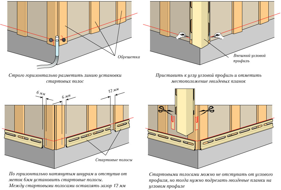 Для установки старта отбивают шнуром горизонтальную линию по всему периметру дома на высоте 60 мм (стандартная высота стартовой полоски) от верха отлива