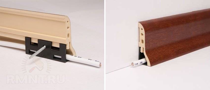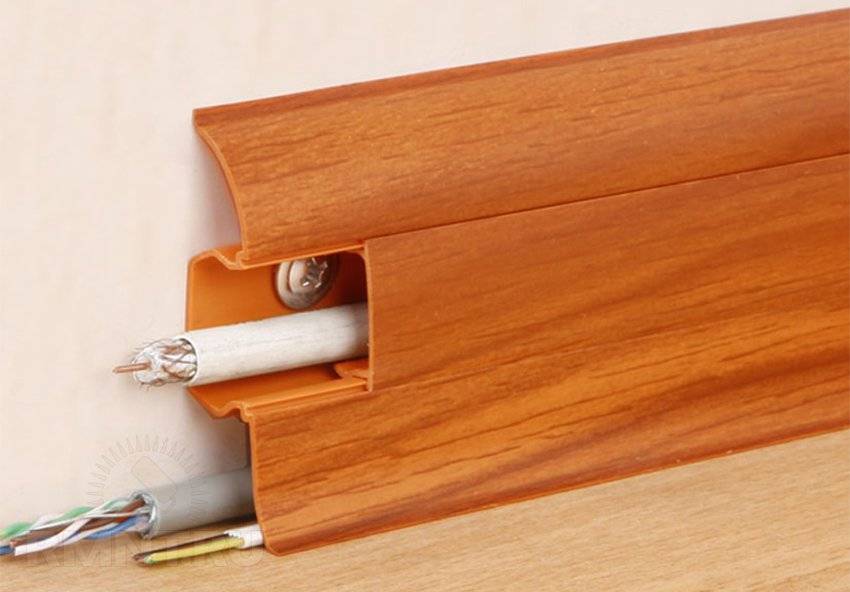 До недавних пор в деревянных плинтусах было затруднительно протянуть проводку. Но сегодня плинтуса изготавливаются со специальным каналом.