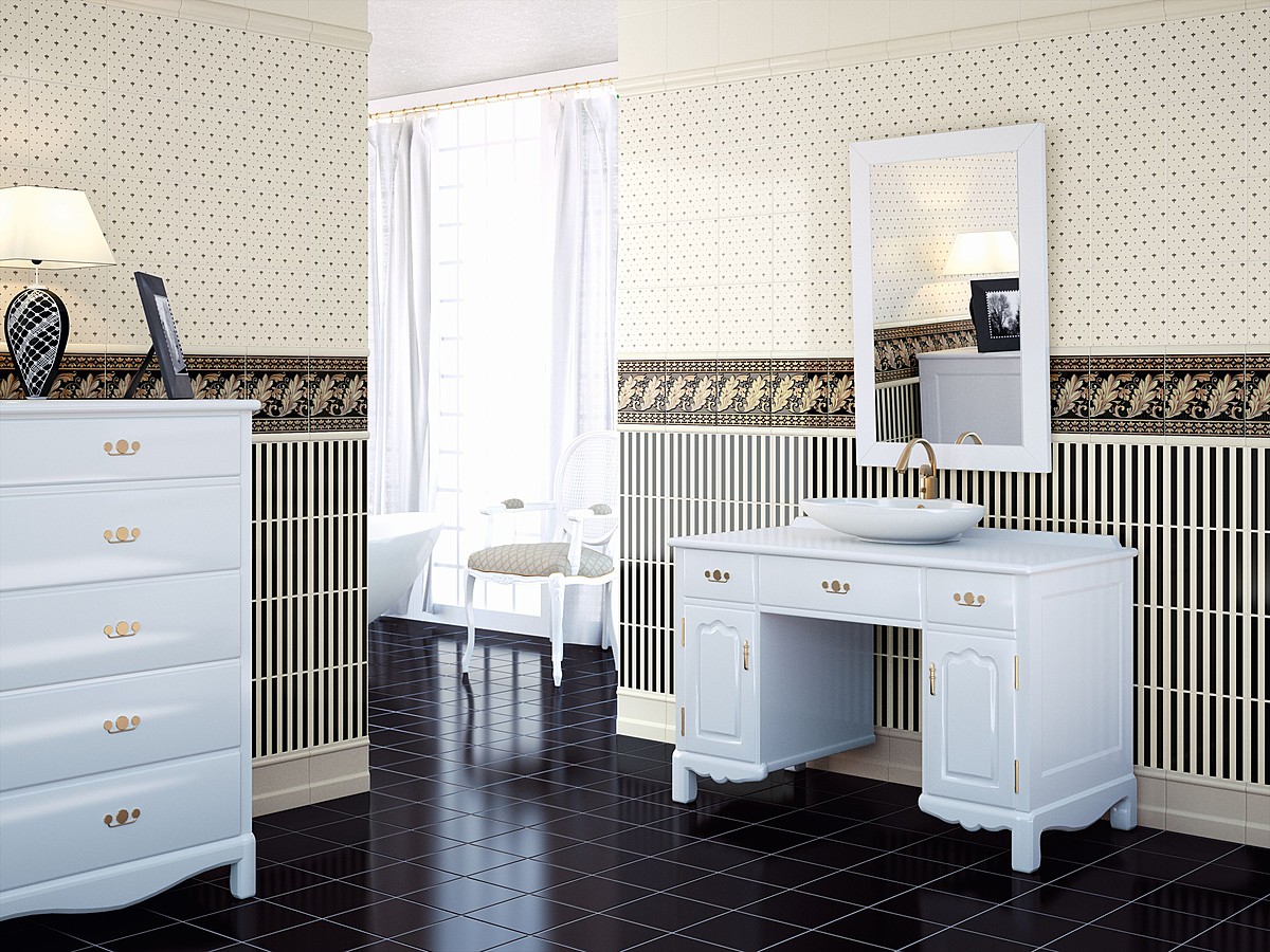 Необходимо подбирать такой цвет плитки, который бы гармонично сочетался с цветом стен, а мебель при этом выделялась