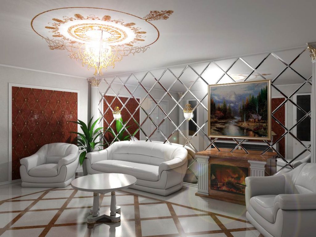 Зеркальная плитка хорошо подходит для классической гостиной, делая ее светлее и комфортнее