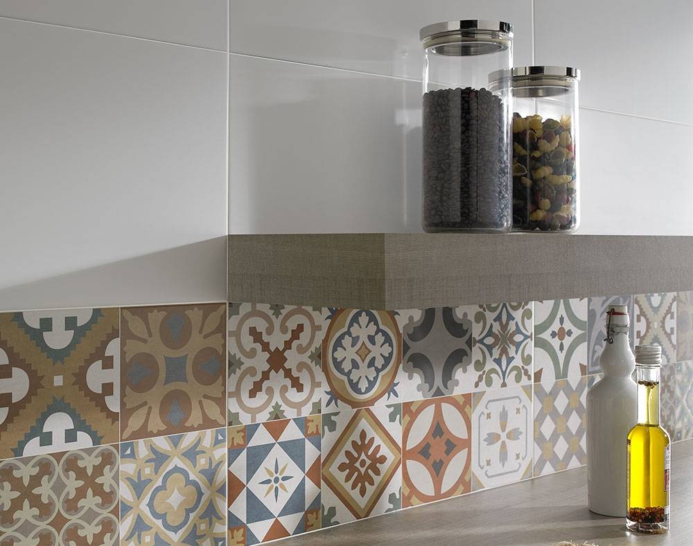 Прекрасно вписывается в современный стиль гладкая, одноцветная плитка с простым рисунком, а также вариант с принтом в стиле 80-х годов с 3D эффектом.