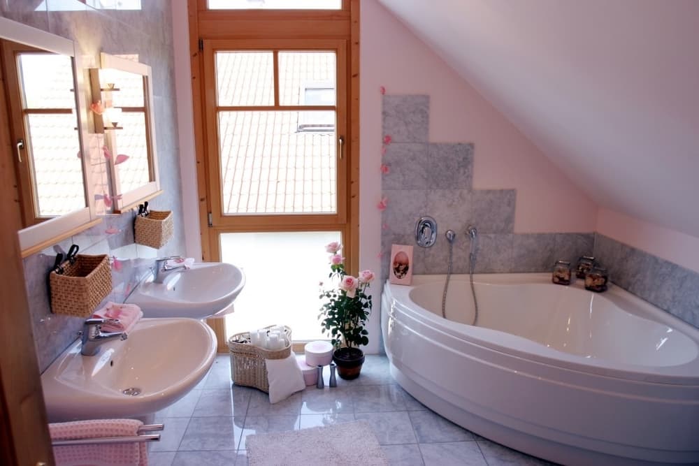 В маленьких ванных комнатах угловая ванна поможет сохранить много места