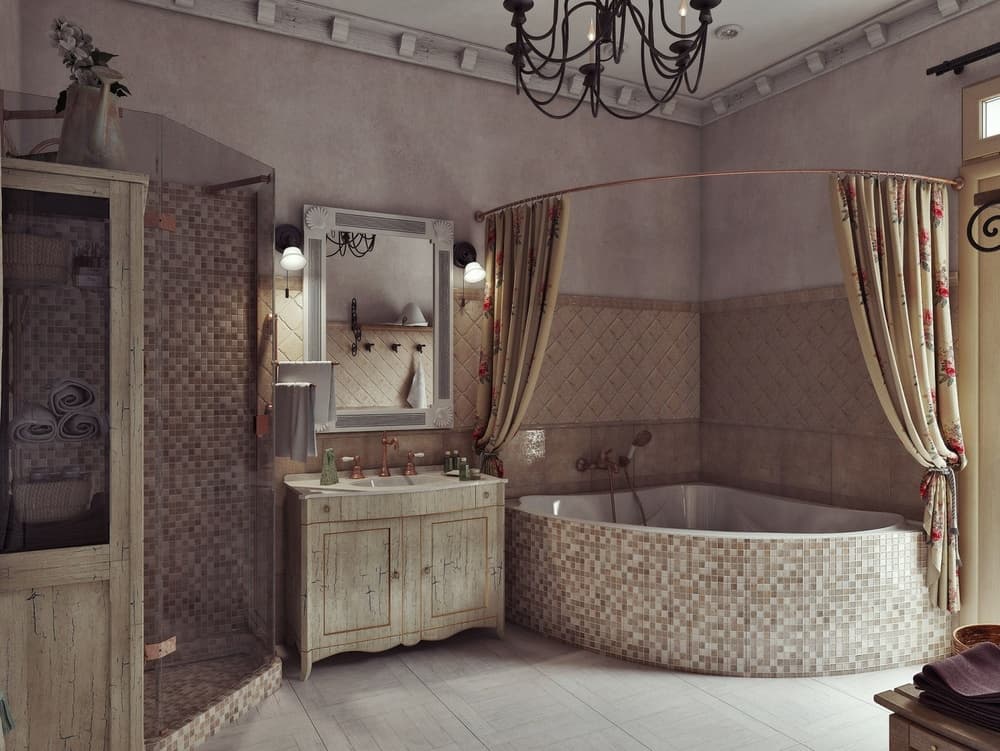 Богатый прованс – сдержанность, дух старины и немного винтажных деталей, которые становятся главным украшением интерьера. Занавески смотрятся богато. Такой дизайн будет стоить недёшево: много мозаики, а мозаика — элемент декоративный. Решение выглядит изысканно. Но подойдёт ли оно для маленькой ванной — ещё вопрос.