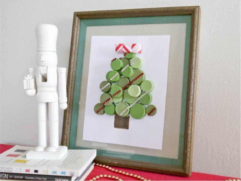 - Интересным вариантом будет сделанная ёлка из крышечек своими руками. Делается очень быстро: из бутылки вырезаем ёлку, и клеим на неё крышечки, которые соединяем в гирлянды.