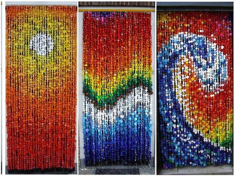 - В доме мы можем оформлять крышечками картины, панно, перегородки, ширмы, и даже сделать из них шторы.
