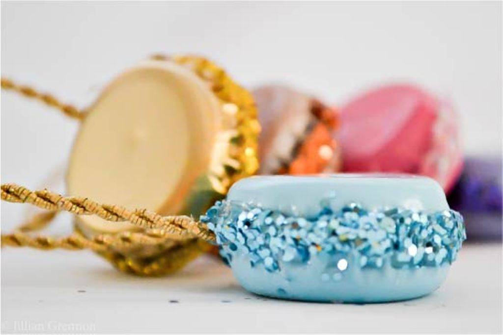 Возьмите старый ёлочный шар, обклейте его крышками, чтобы выпуклая сторона прилегала к шару. Украсьте получившуюся игрушку по своему желанию. Вы можете сделать целый комплект из игрушек, которые будут схожи по расцветке и декору. Дайте волю фантазии.