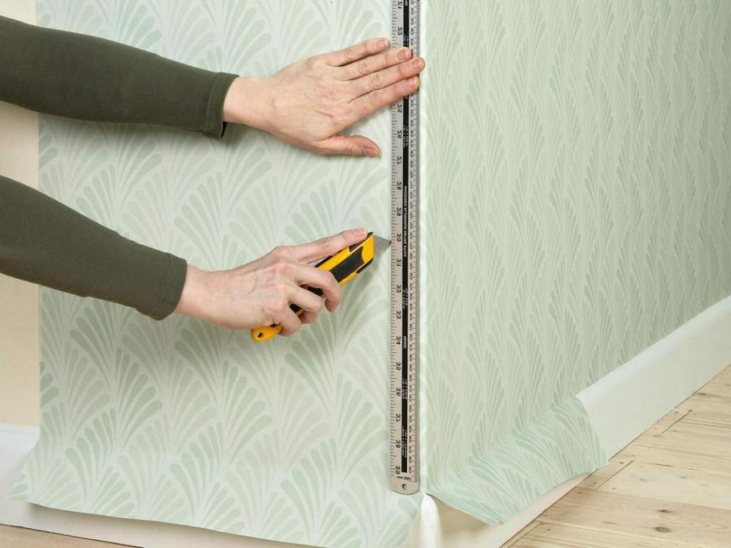 Для того чтобы стыки обоев в углах получились максимально ровными и аккуратными, следует наклеить полосу так, чтобы оставался нахлест 2-3 см, последующую полосу также нужно наклеить с напуском в углу. После этого нужно приложить широкий шпатель и при помощи строительного ножа аккуратно отрезать напуски.