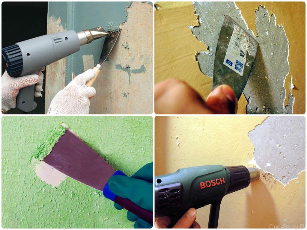 - Для удаления краски нужно знать, какой тип лакокрасочного материала использовался. Если это водоэмульсионная краска, то на стену наклеивается кусок газеты, и после высыхания сдирается вместе с краской. Если это масляная краска, то потребуется строительный фен и шпатель. Под воздействием температуры краска трескается, сжимается и ее легко соскоблить с поверхности. Растворитель – это универсальный вариант, подходящий практически для любого вида красок. Кистью растворитель наносится на поверхность сверху. После 3–6 часов краска размягчится и ее можно будет соскрести.