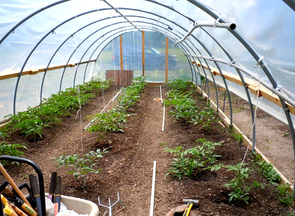 - Например, в теплицах туннельного типа (с шириной 2,5) располагают по бокам по 1 грядке шириной 100 см, оставляя по центру проход в 0,5 м. На каждой гряде в этом случае выращивают томаты в 2 строки.