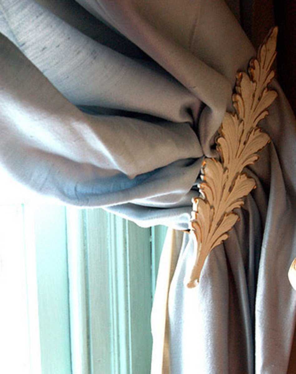 Как и сам текстиль, аксессуары для него должны соответствовать стилевому решению интерьера. В классических помещениях лучше использовать украшения из дерева, металла или кожи. Также удачно будут смотреться зажимы в виде кистей с бахромой из толстой нити золотистого или серебристого цвета.