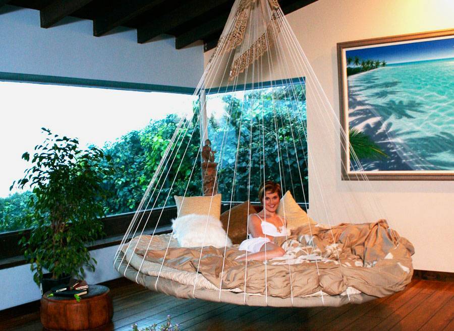 , которую подвешивали к потолку с древних времен. Сегодня дизайнеры с удовольствием используют подвесные кровати и в загородных интерьерах, и в городских квартирах.