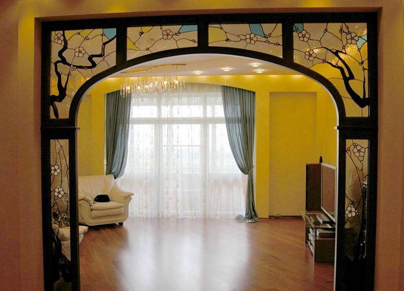 Вариант 4. В проем достаточной ширины можно вмонтировать арку, изготовленную из деревянного каркаса и витражного стекла. Выглядит такая конструкция легко и нарядно. Она пропускает свет и визуально расширяет пространство. В данном примере форма арки повторяет форму окна, но является главным акцентом.