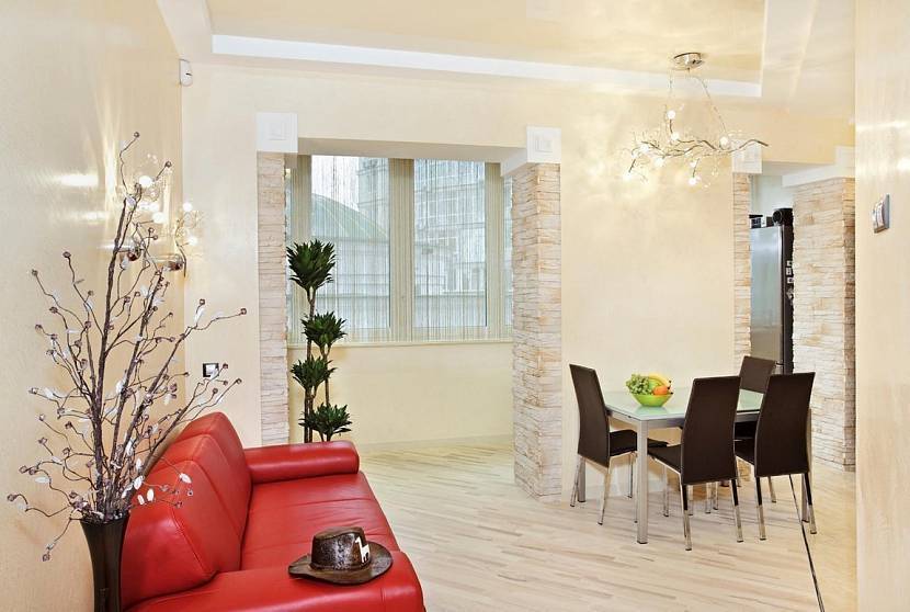 В маленькой квартире, типа хрущевка, достаточно часто отказываются от дверных полотен между гостиной и прихожей. Таким образом предоставляется возможность, создать условное зонирование и одновременно расширить эти две комнаты.