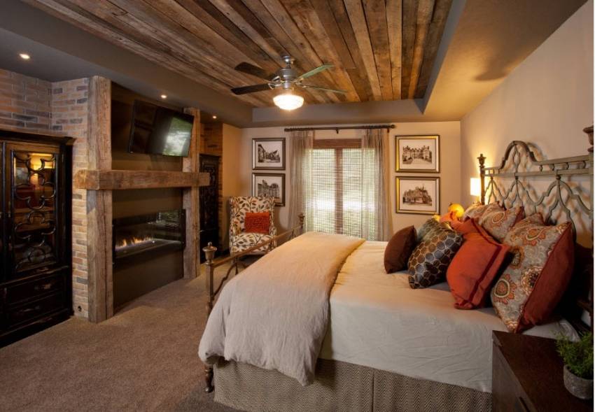 Навесной потолок из дерева выглядит довольно эффектно, в особенности в интерьере в стиле кантри или прованс