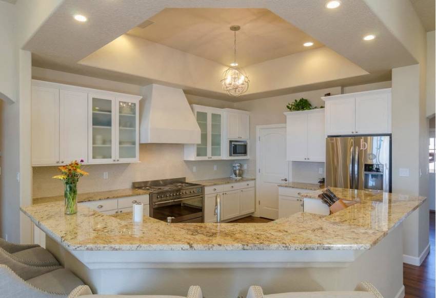можно обойтись без сложной двухъярусной конструкции. Например, кухня-столовая с натяжными потолками предполагает устройство только одного уровня. Однако технология спайки позволяет сшивать полотна разного цвета и с разным декором. Сочетание светлого фона и красочного центрального объекта – фрагмента с рисунком или другого цвета, визуально изменяет пропорции;