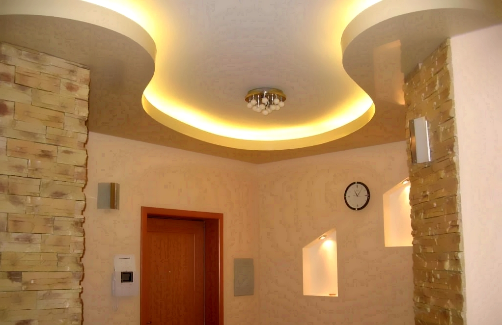 Отдельные элементы крепят саморезами или специальными подвесами на металлический каркас, в котором очень легко спрятать (а при необходимости — заменить) электропроводку. В зависимости от сложности форм, потолки из гипсокартона могут быть одноуровневыми, многоуровневыми и фигурными.