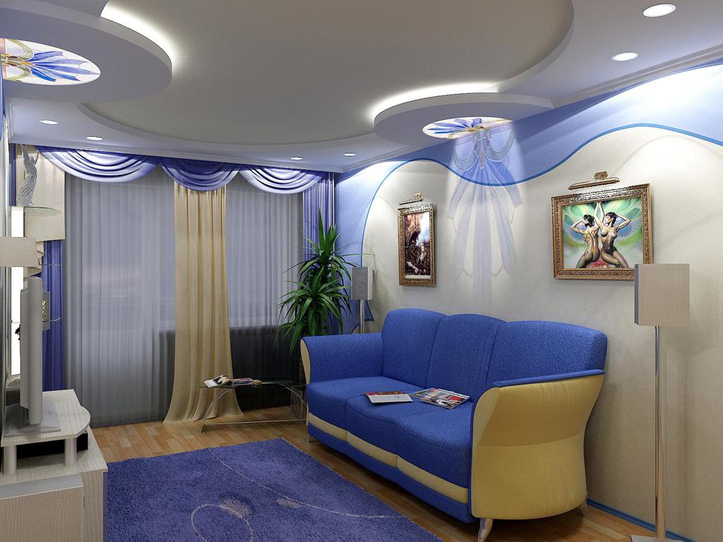 Позволяет визуально разделить помещение на зоны и создать в нем ощущение пространственной глубины. При помощи таких сложных конструкций в несколько уровней, можно с легкостью украсить любой интерьер.На фото интерьер гостиной с многоуровневым потолком из гипсокартона.