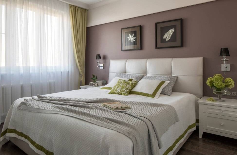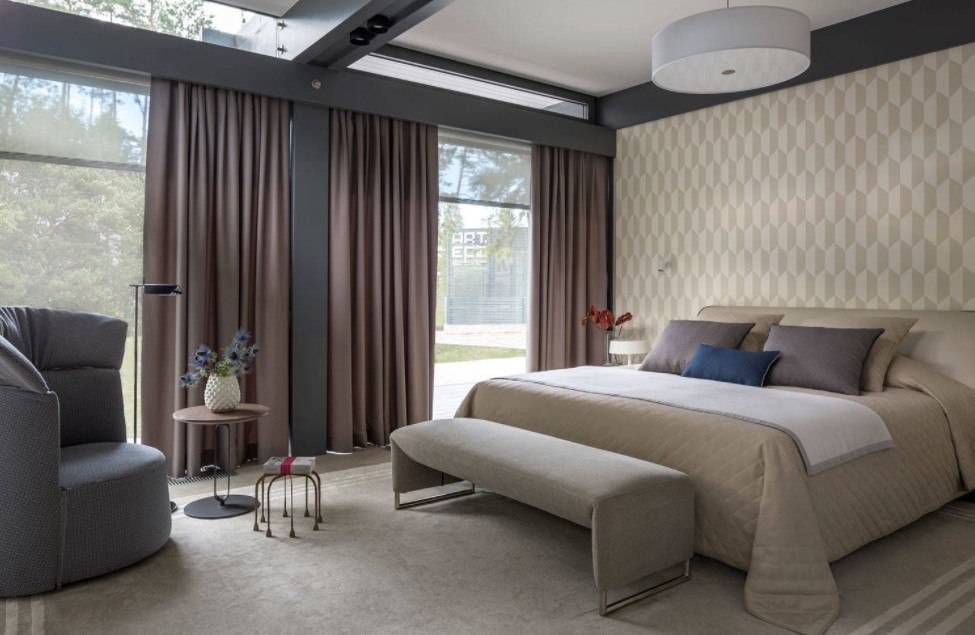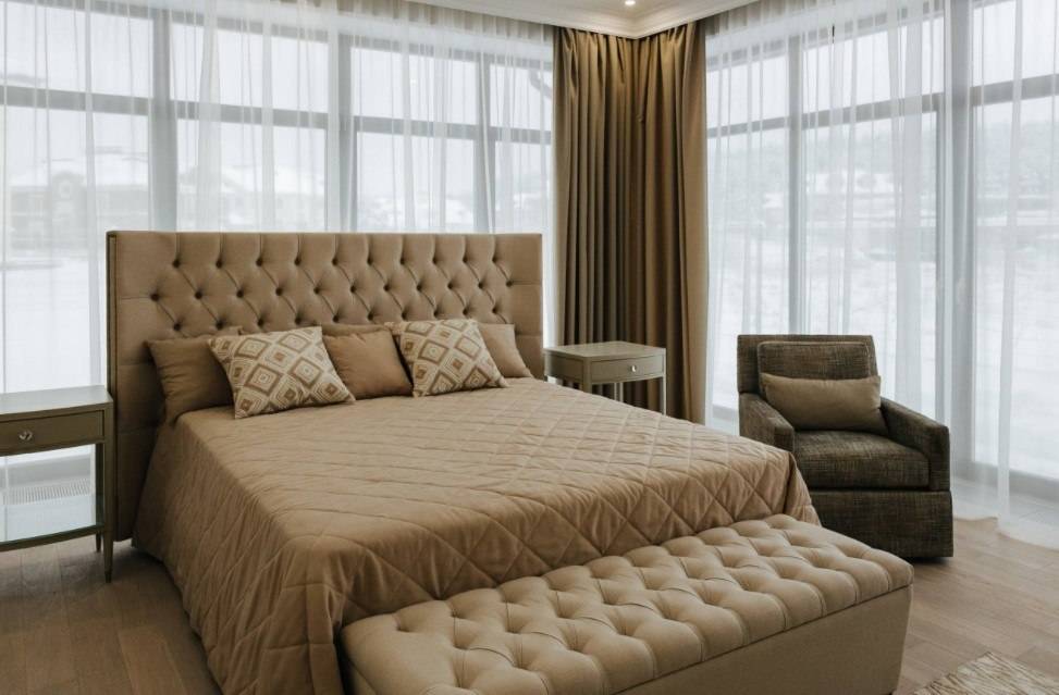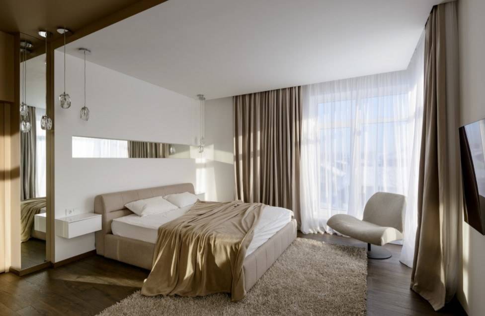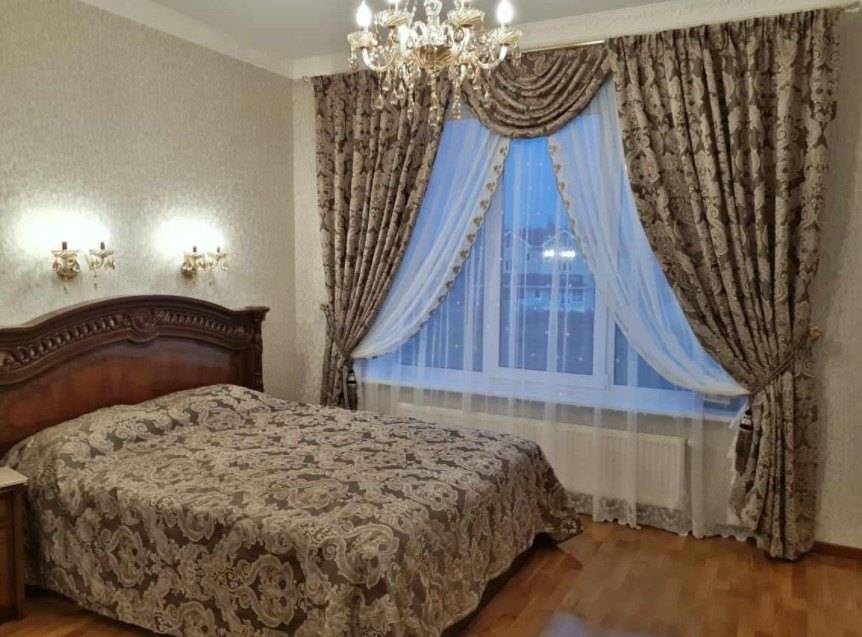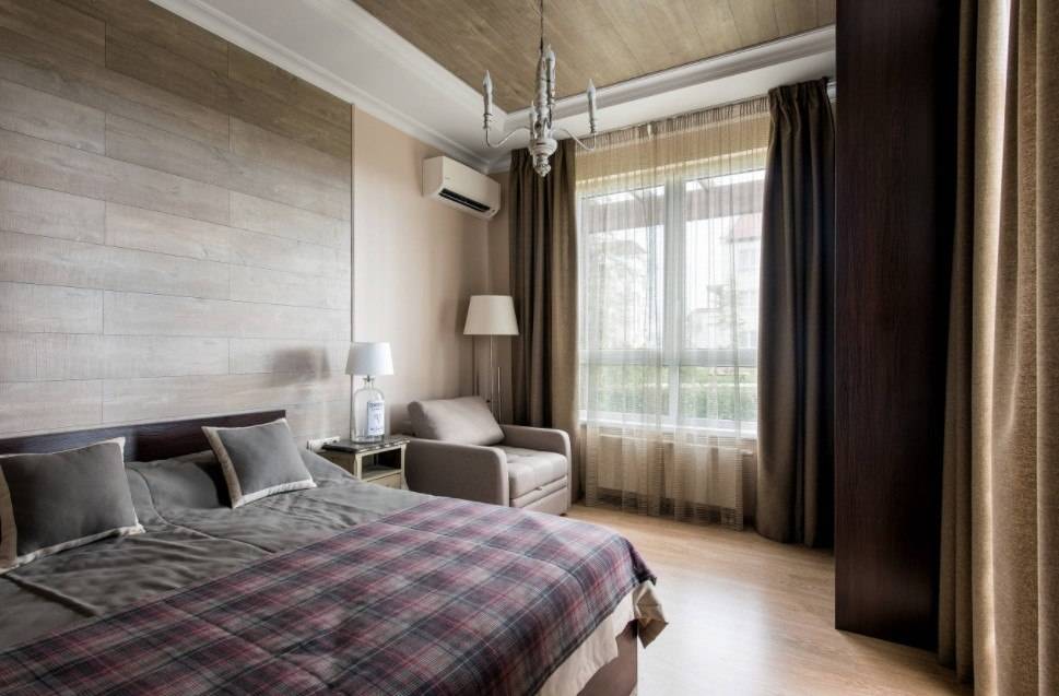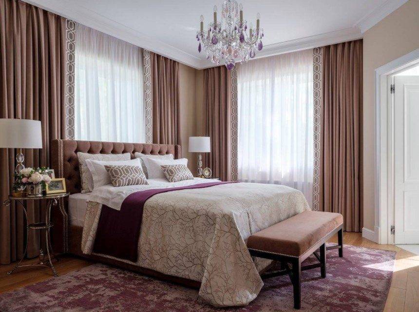 - Для классических спален актуальны комплекты из покрывала и штор однотонной расцветки. Чаще всего выбираются изделия бежево-коричневой гаммы, которые подходят для любого цвета стен, создают уютную атмосферу;