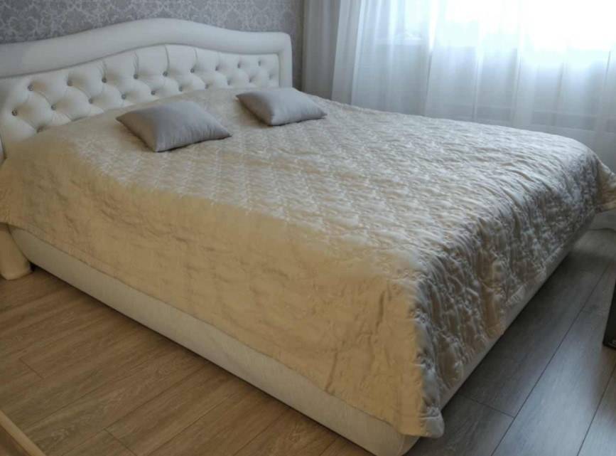 В качестве покрывала на кровать лучше остановить выбор на большом размере, чтобы прикрыть края мебели на 20-30 сантиметров.