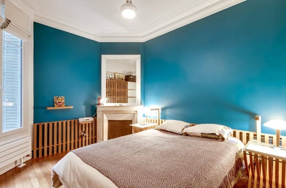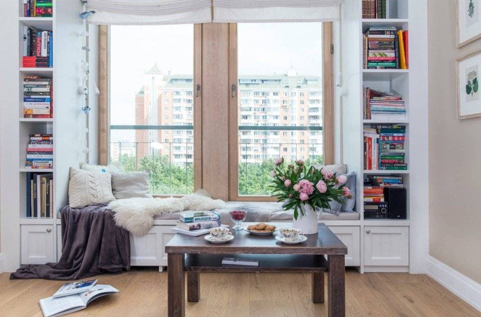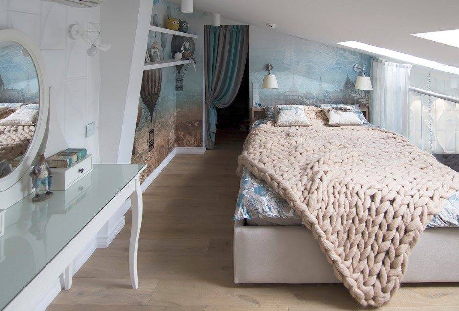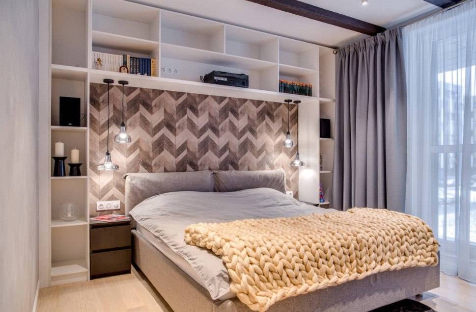 Спальня для любителя чтения: «книжные» обои и вязаный плед