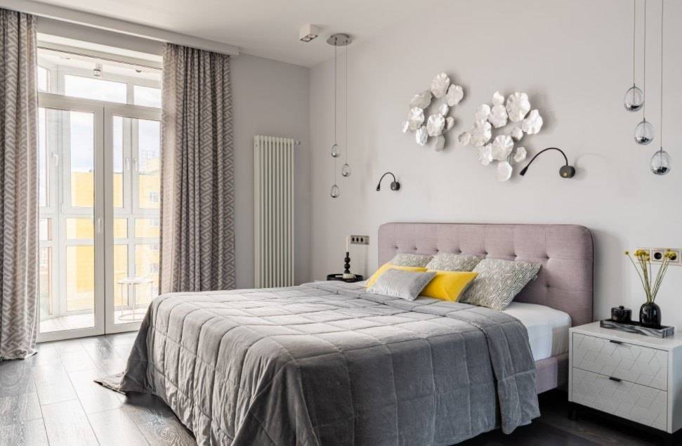Светло-серая спальня со сдержанным, но в то же время шикарным декором: нашитые вручную объемные цветы