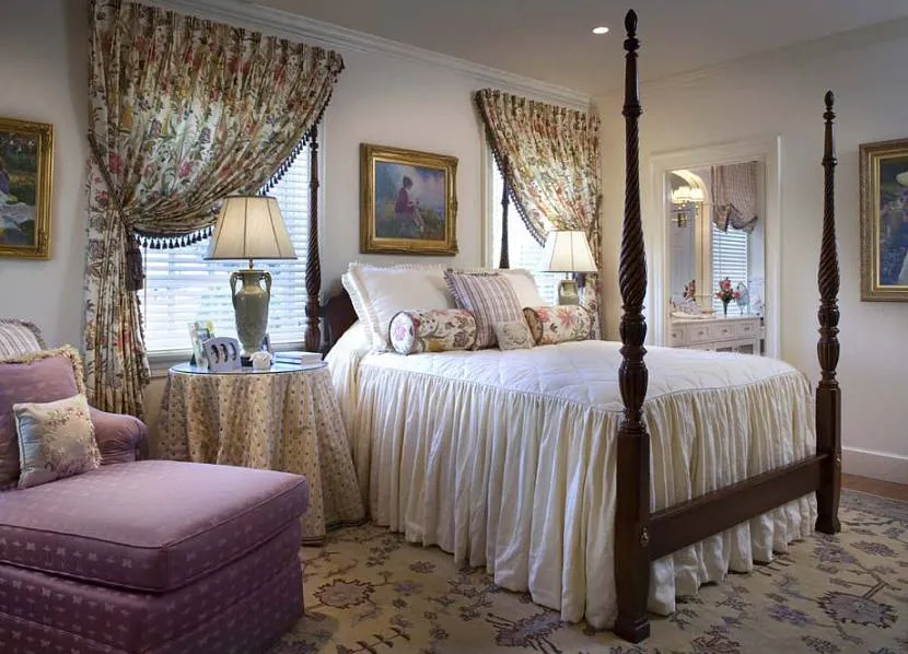 Это стиль французских усадеб, где присутствует натуральный текстиль с растительным принтом в сливочных теплых тонах. Приветствуются узкие однотонные рюши, в цвет к тону растений. Пришейте кисти или сборку по принципу «маркиза».