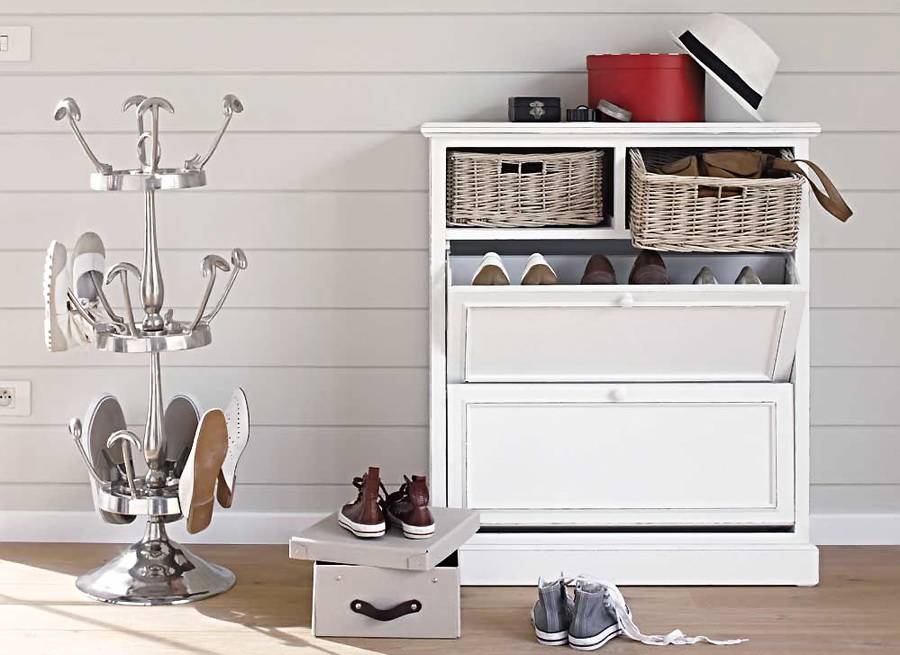 Обязательный элемент в прихожей — полка для обуви. Обувницы ставятся на пол в коридоре. Они бывают закрытые или открытые. В зависимости от количества обуви, полочки бывают разные по размерам.