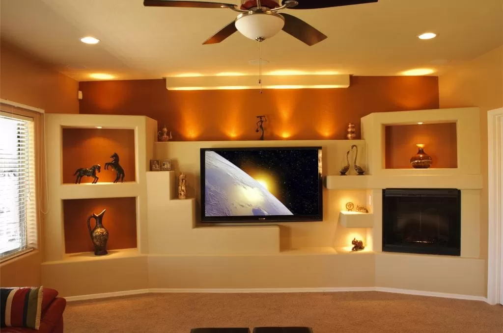 В зале будут удобны объединенные стеллажи, включающие полки для телевизора из гипсокартона. На соседних подставках размещают и посуду, и книги, и предметы домашнего кинотеатра или другую технику. Крупная, занимающая всю стену конструкция, служит аналогом мебельной стенки. В отличие от корпусных шкафов можно самостоятельно сконструировать изделие в соответствии со своими потребностями и общим стилем комнаты.