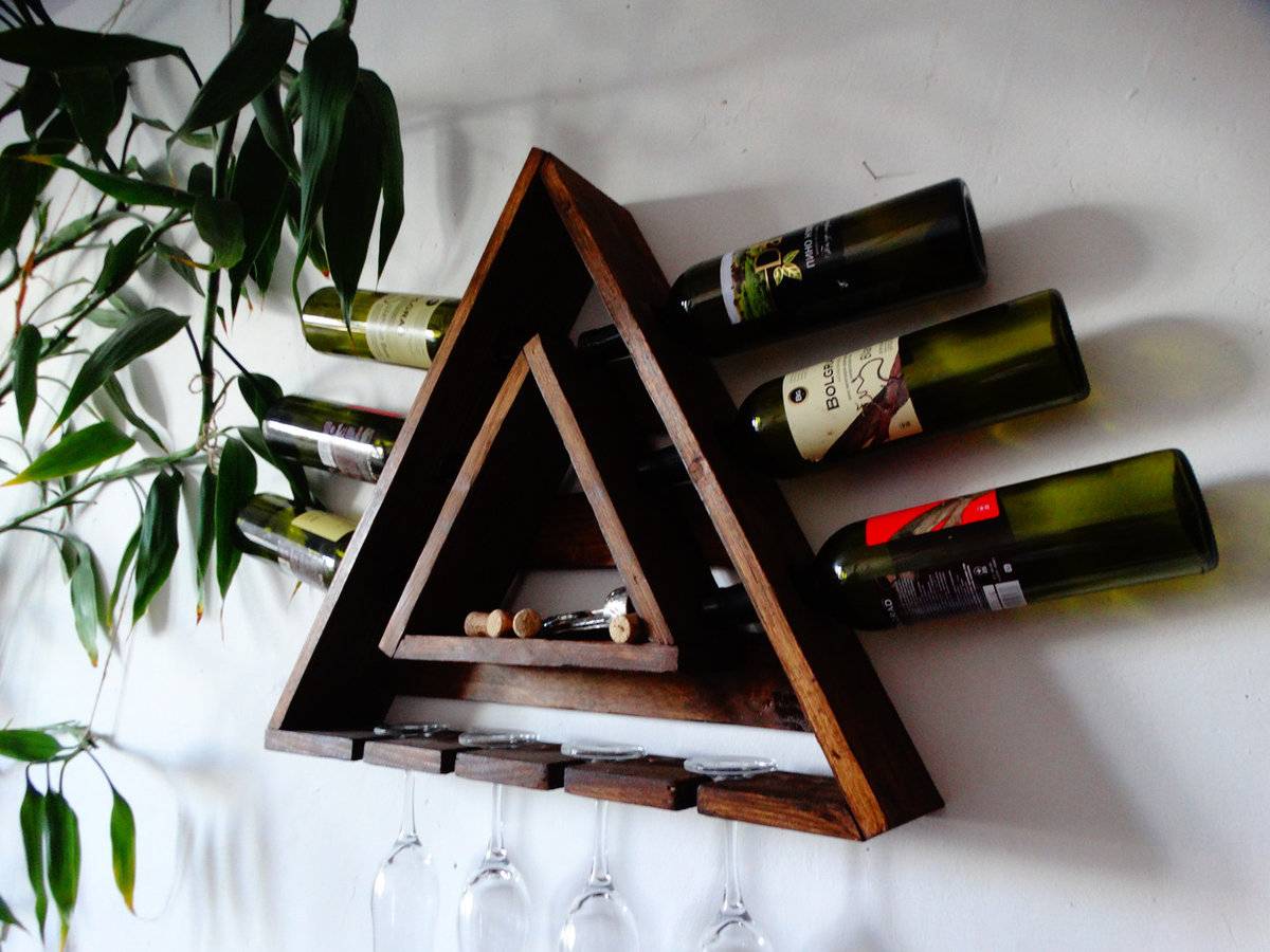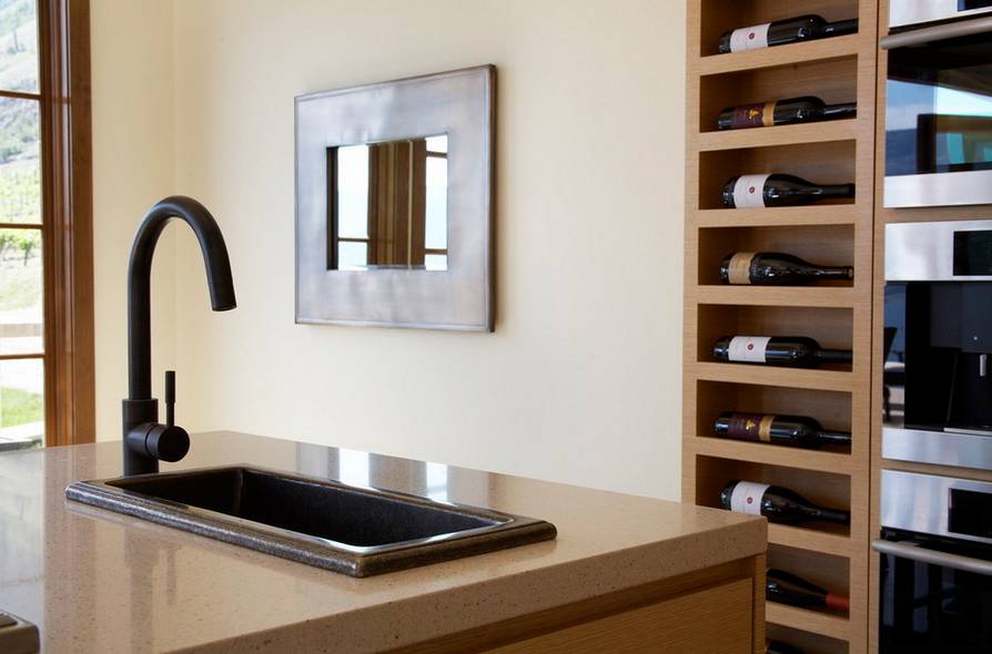 Открытые полки можно использовать и в качестве бутылочниц. В этом случае на полках делают отверстия, в которые и помещаются бутылки горлом вниз. В этом случае они будут храниться в положении «по диагонали». Или же можно сделать специальные мини-ящички для хранения бутылок в вертикальном положении.