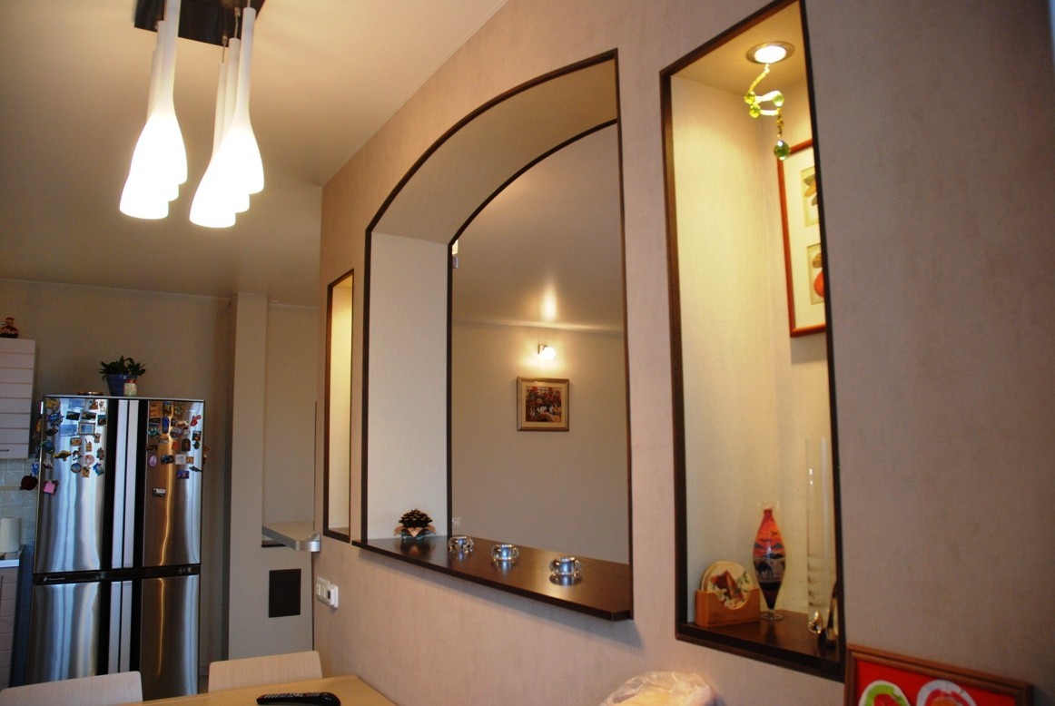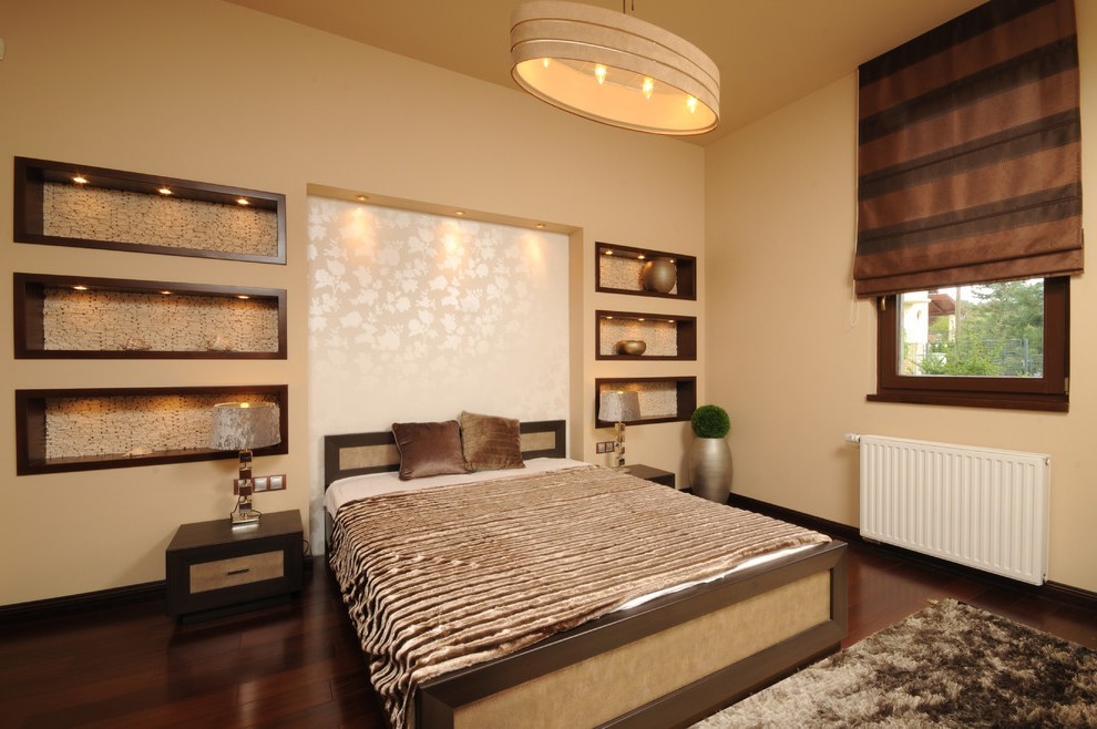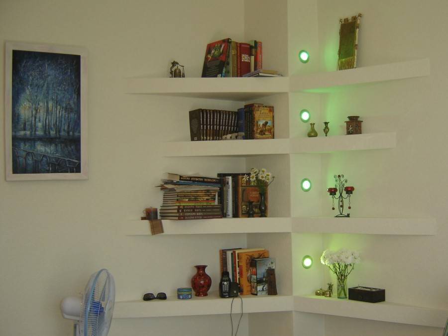 Выемки в стенах, заполненные ими, решат проблему рационального использования пространства, устранив возможные дефекты ниши. Комната при этом будет весьма оригинально выглядеть.