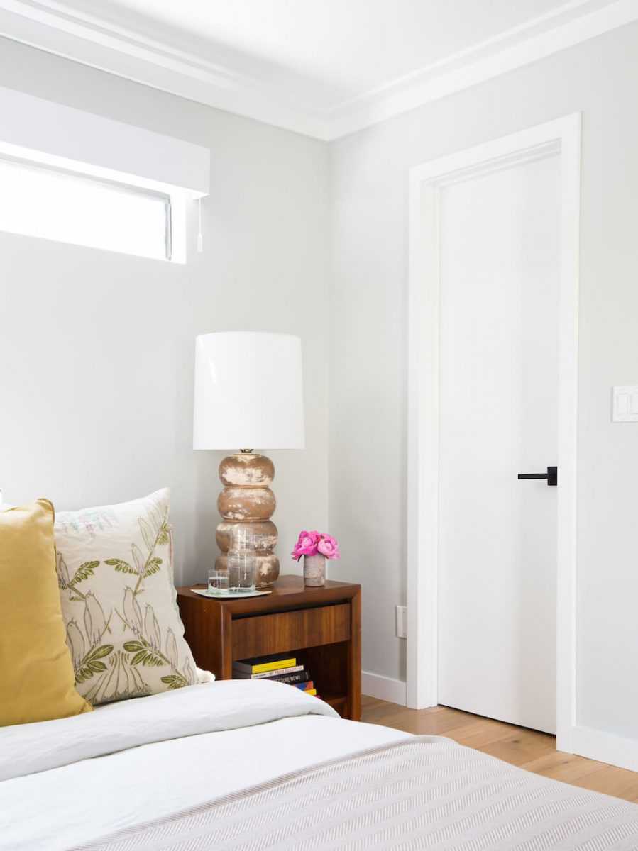 Небольшая спальня в белом цвете с серыми портьерами из льна