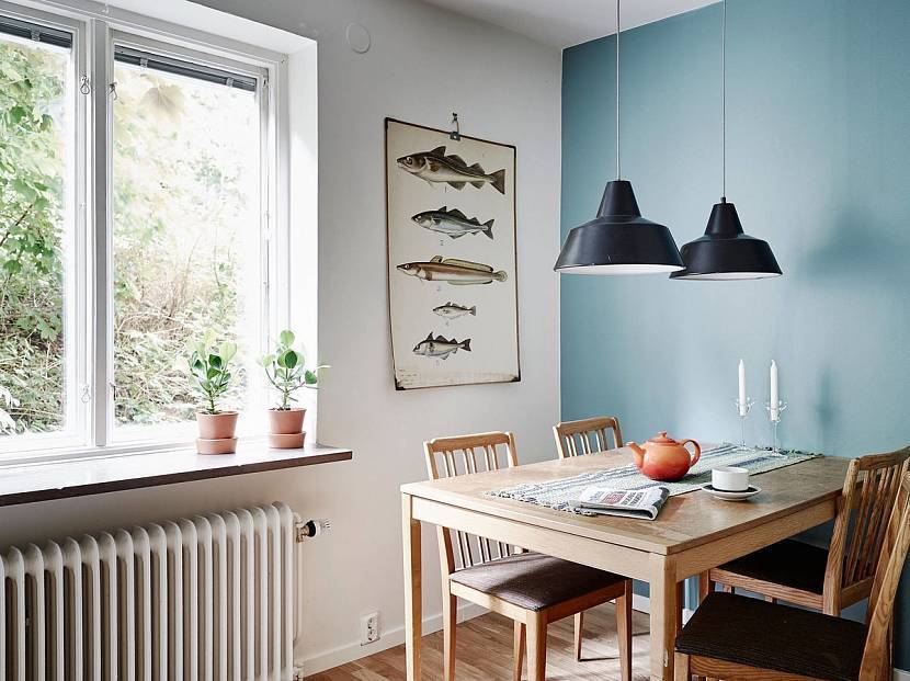Группы последних приборов размещают прямо над акцентной зоной — обеденным столом.